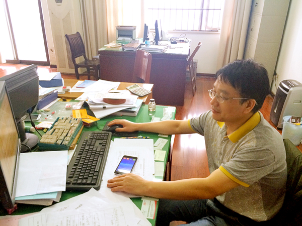 走進(jìn)財務(wù)部的辦公室,周家煌的辦公桌上的擺設(shè)一目了然:桌面整潔干凈,桌上的文件排放的整齊有序。左上角壘起來的倆堆書籍,其一是《財務(wù)會計》、《中國稅務(wù)》等財務(wù)專業(yè)的雜志;另一堆書籍置于頂部的是《計算機(jī)財務(wù)管理:財務(wù)建模方法與技術(shù)》,往下的是諸如《計算機(jī)辦公軟件應(yīng)用》、《信息時代的財務(wù)創(chuàng)新》等。
