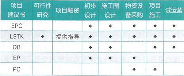 常見的工程總承包方式。工程總承包的主要方式有:設(shè)計(jì)采購(gòu)施工總承包(EPC )、交鑰匙工程總承包 (LSTK )、設(shè)計(jì)建造工程總承包(DB )、設(shè)計(jì)采購(gòu)總承包 (EP )、采購(gòu)施工總承包(PC )。不同的承包方式,參與項(xiàng)目實(shí)施過(guò)程中的不同環(huán)節(jié)(見表1 )。