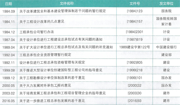 20世紀(jì)80年代,我國(guó)相關(guān)部門就下發(fā)文件,要求在設(shè)計(jì)、施工企業(yè)組建開展工程總承包的試點(diǎn),從國(guó)家頒布的一系列文件中可以看出我國(guó)在推廣工程總承包業(yè)務(wù)方面的幾點(diǎn)變化(見表2 )。